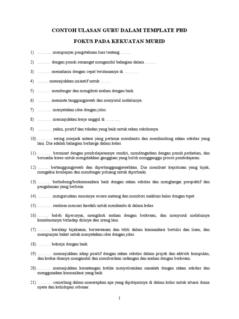 Contoh Ulasan Guru Dalam Template Pbd Fokus Pada Kekuatan Murid Pdf